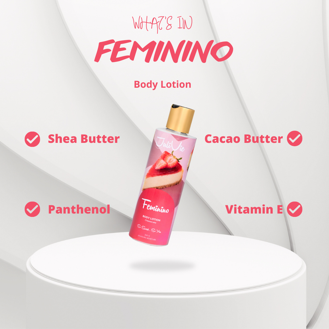 Embrace your sweet side with Feminino Body Lotion. This rich yet lightweight formula delivers deep hydration while wrapping your skin in the irresistible scent of fresh cheesecake note.