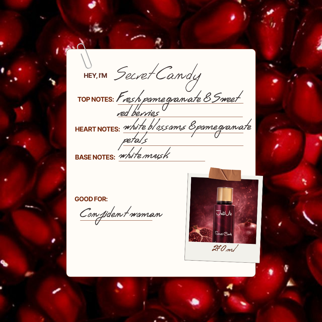 Refresh your scent with Secret Candy Body Splash. Designed with a delightful mix of pomegranate freshness and rich musk, it delivers a captivating aroma that lasts for hours. Perfect for daily wear, layering, or refreshing your fragrance throughout the day.